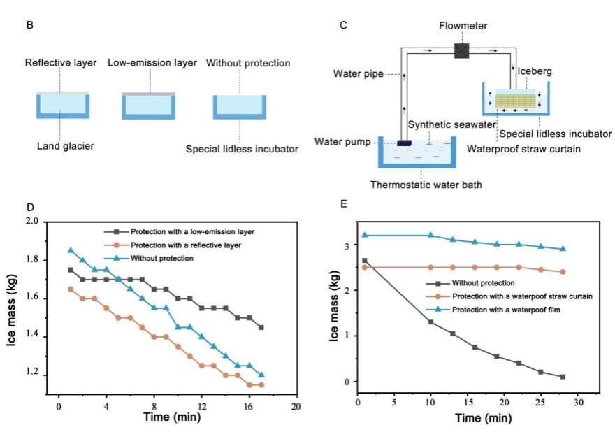 基于上述热传递途径的差异,作者从热调控的角度将冰川分为“陆地冰川”与“海水中的冰川”两类,并针对其分别提出了相应的保护策略:对陆地冰川,采用热反射粉体与低发射率材料复合覆盖的方式,在减少太阳辐射吸收的同时抑制与环境的热辐射交换,从而实现隔热保温;对海水中的冰川,则通过设置水下屏障结构,既阻隔冰体与海水直接接触、降低对流传热,又起到保温作用。实验估算表明,该措施可令陆地冰川融化损失减少20%以上,海水中的冰川融化损失降低50%以上。若将这一方案推广至全球冰冻圈范围内的冰川保护工程,有望至少延迟冰川融化数十年。